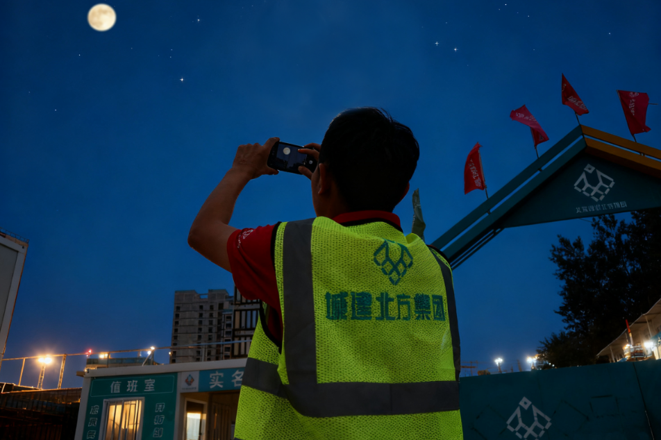 暮色漫过工地的围挡,中秋的圆月悬挂于天心。走出办公室,他抬头望着这栋新封顶的楼,一股骄傲感油然而生,这是他参与建设的楼宇,承载着项目团队无数个日夜的汗水与付出。他举起手机调整角度,按下快门,像是把“奋斗”与“思念”都定格进了画面。